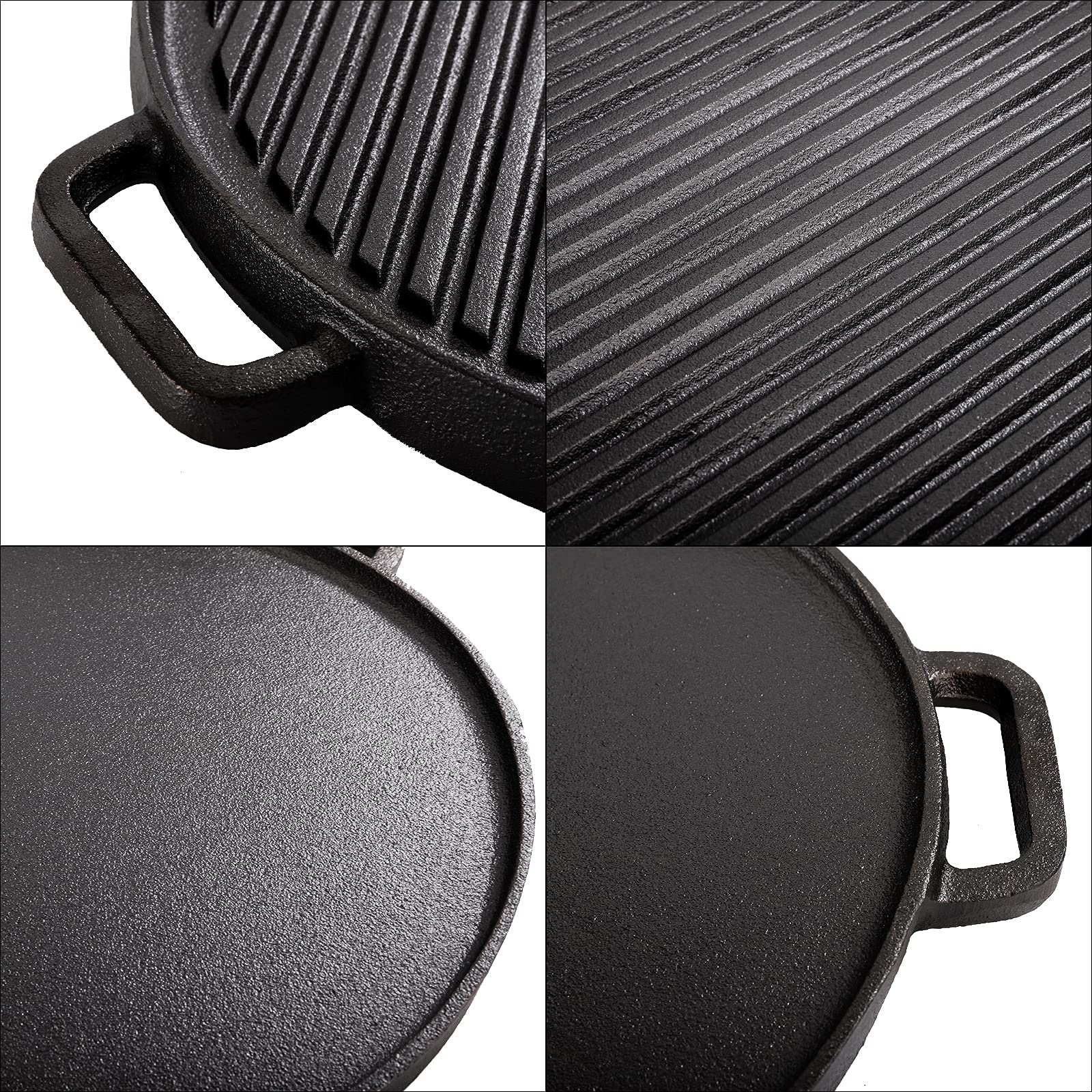 - 12 inch Cast iron griddle, with the smooth side and the ribbed side, The possibilities are endless to with dual cooking sides