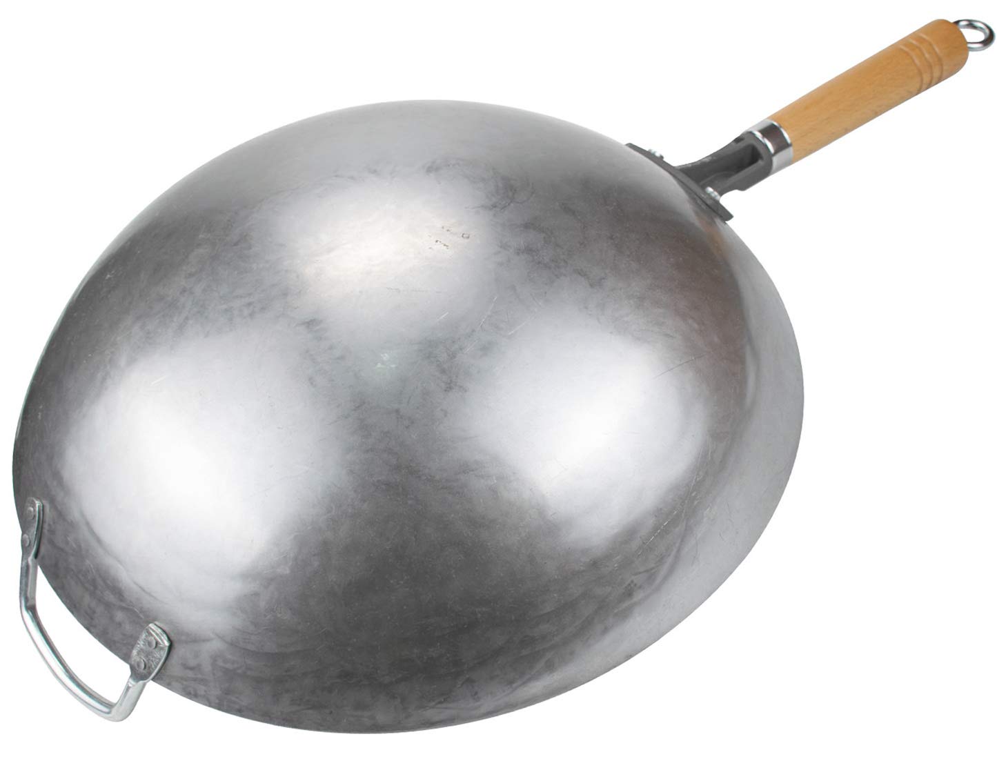 Lawei 14 Inch Carbon Steel Pow Wok - Hand Hammered Wok with Wooden and Steel Helper Handle, Round Bottom Wok