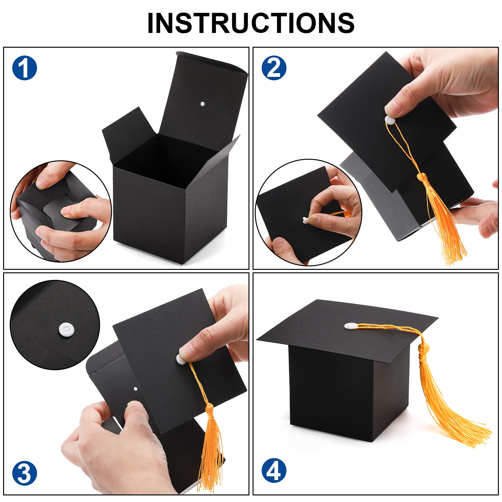 - DIY Gift Box: Our graduation cap treat boxes are unfinished in the packaging, which need you to assemble the box and tassels by hand. Detail assemble process please refer to pictures, easy to install. Enjoy the fun of DIY and spend wonderful time with your family or children.